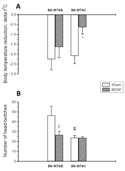 Earlier, we found that the intensity of the hypothermic response evoked by a single 8-OH-DPAT injection in mice chronically treated with 8-OH-DPAT was significantly lower in B6-M76C than in B6-M76B animals. These results were in accordance with the data obtained from a cataleptic-prone CBA mouse strain [], and it was suggested that in the B6-M76C line post-synaptic 5-HT1A receptors undergo more effective desensitization []. Here, we found that central BDNF administration results in a reduction in 5-HT1A receptor functionality in B6-M76C mice but not in B6-M76B mice. Taken together with the data on the central role of post-synaptic 5-HT1A receptors in the mediation of 8-OH-DPAT-induced hypothermia [,], the current results confirm our previous suggestion.