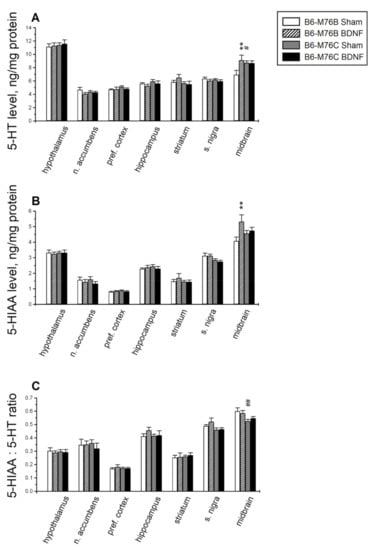 Major differences in the serotonin level and its metabolism were found in the midbrain raphe nuclei area—the main brain region for the localization of 5-HT cell bodies. Two-way analysis of variance showed the effects of the treatment and the treatment x genotype interaction for 5-HT in the midbrain (Table 1). Post hoc analysis revealed that central BDNF administration resulted in the elevation (p < 0.01) of the 5-HT level in the midbrain of B6-M76B, but not B6-M76C, mice (Figure 3A). It should be noted that the 5-HT level in the midbrain of sham B6-M76C mice were higher compared to those for B6-M76B mice of the sham group (p < 0.05).