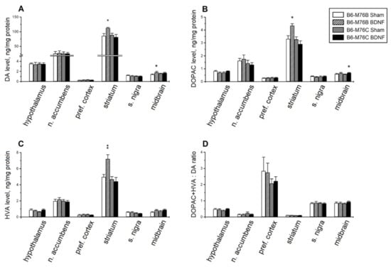 BDNF significantly affected the brain levels of DA and its metabolites, DOPAC and HVA. Two-way ANOVA showed the effects of treatment in the midbrain and treatment x genotype interaction in the striatum for DA (Table 2). Post hoc analysis revealed a rise in the DA level in the striatum (p < 0.05) and in the midbrain (p < 0.05) of B6-M76B mice (Figure 4A). Two-way ANOVA detected the effects of the genotype and treatment x genotype interaction on DOPAC in the striatum and the effects of the genotype, treatment and treatment x genotype interaction on HVA in the striatum (Table 2). An increase in the levels of the DA metabolites, DOPAC (p < 0.05) and HVA (p < 0.01), was found in the striatum of B6-M76B mice (Figure 4B,C). Moreover, two-way ANOVA revealed the effects of the treatment on the midbrain and the treatment x genotype interaction on the hypothalamus for DOPAC, as well as the effects of the genotype on the substantia nigra and the treatment on the midbrain for HVA level (Table 2). However, post hoc analysis only demonstrated an increase in DOPAC levels in the midbrain of B6-M76C mice (p < 0.05) (Figure 4B).