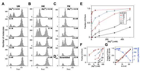 The FM core underwent the B-Z transition with the midpoint [Mg2+] of ~0.5 mM (Figure 1C), which is within the range of physiological [Mg2+] [52]. This midpoint concentration is about two orders of magnitude less than the value for HM core. At higher concentrations (5 and 50 mM), the FM core mainly exists in Z-form. An FM DNA molecule can also be prepared enzymatically, and the ‘enzymatic FM core’ also exhibits a similar behavior but with less efficiency (enzymatically methylated by 200 U/mL of M.SssI (Figure 2A) as in Ref. [49] and 400 U/mL of DNMT1 (Figure 2B), respectively) again because of the imperfect methylation of the CG core. Since high [Mg2+] has no effect on the FRET efficiency from a scrambled sequence (Figure 1D), the FRET change is sequence-specific and originates from the B-Z transition in CG repeat sequences.