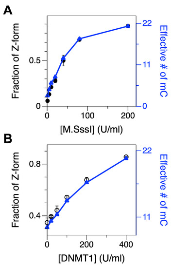 We tested the effect of M.SssI concentration on methylation as shown in Figure 2A and Supplementary Materials, Figure S5A. In that assay, we stopped the reaction of DNA methylation after 2-h incubation. As expected, the population of Z-DNA, indicative of the extent of cytosine methylation, increased consistently with the concentration of M.SssI, and beyond the concentration of ~100 U/mL, the population of Z-DNA gradually leveled off. Using the relationship of the number of methylcytosines and the population of the Z-state acquired above, we were able to estimate the effective number of methylcytosines in the core. At the maximum resolution for methylated cytosines (1~2 m5C from Figure 1F), the detection limit for DMT would be ~5–10 U/mL in our assay (Figure 2A and Supplementary Materials, Figure S5A), which is similar to the value reported in Ref. [34]. Assays optimally detecting single methylated cytosines with nucleases or antibodies, however, exhibit remarkably lower detection limits for DMT [38,60,61]. With [M.SssI] = 200 U/mL, M.SssI methylates almost all the cytosines in the core sequence except for cytosines near the dye molecules.