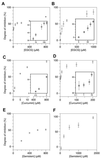 We tested the effect of natural compounds known as DNMT1 inhibitors on the methylation activity of DMT. We added different inhibitor compounds at various concentrations to the reaction mixture. We prepared EGCG (epigallocatechin gallate), polyphenol naturally found in green tea leaves, in deionized water [57,63,64], and curcumin from turmeric (rhizomes of Curcuma longa), medicinal ingredient of an Indian condiment, curry, in 2.5% DMSO in water. Curcumin’s pharmacological effect has been documented as a DNMT1 inhibitor over years [21,28,35,65,66,67,68,69,70,71]. Genistein, isoflavone naturally found in soybeans and coffee beans, was also prepared in ~1.75% DMSO in water and tested as a DMT inhibitor [21,28,35,39,72,73].