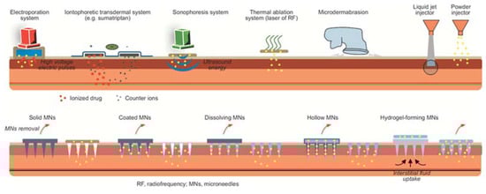 In direct methods, though considered a little invasive, pores are created in the SC, through which the entry of solutes into the epidermis and eventually the dermis is forced by means of mechanical, thermal, or pressure-based approaches. Currently, the most popular direct methods include (i) the use of different types of microneedles (MNs)—solid, coated, hollow, dissolving, or hydrogel-forming—to force percutaneous permeation of bioactive compounds, and (ii) microdermabrasion (mechanics-driven) and thermal ablation (heat-driven). Other physical methods have been used to promote percutaneous permeation, though to a lesser extent; one example is that of jet injectors, whereby solid, liquid, or plasma jets force drug delivery by means of the high pressure exerted when they hit the skin [1].