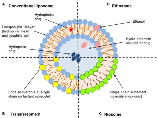 - ethosomes, soft VNs whose structure is closely related to that of liposomes, the main difference being the presence of ethanol in moderate to high concentrations, which confers the vesicles high malleability and the ability to significantly enhance the percutaneous permeation of highly lipophilic molecules [48];