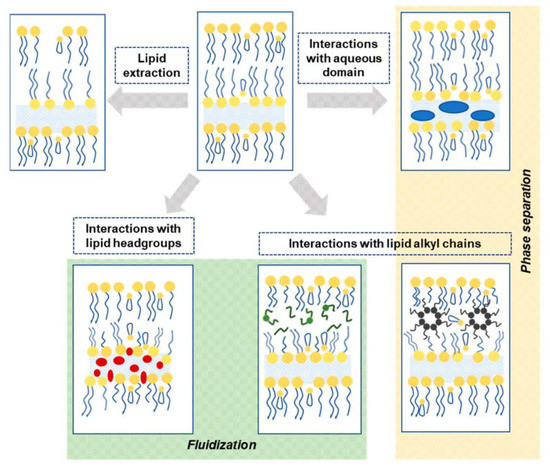 The mechanisms through which ILs or API-ILs display enhanced skin permeation are not fully unveiled and are primarily—though not exclusively—dependent on the specific structural and physico-chemical features of the IL. Thus, the CPE action of hydrophilic ILs (e.g., 1-ethyl-3-methylimidazolium-based) has been mostly ascribed to their role as polar enhancers able to (i) increase solubility and partition of hydrophilic drugs, and/or (ii) fluidize the SC by disrupting the tight packing of both proteins and lipids (at the headgroups level—Figure 8). In turn, hydrophobic ILs, many of which are SAILs (e.g., CPC, 1-dodecyl-3-methylimidazolium-based ILs), may exert their skin permeation action by (i) increasing solubility and partition of hydrophobic drugs, (ii) inserting into the SC lipid bilayers, causing a disruption of the ordered packing of the phospholipid bilayers or even phase separation or induction of lamellar phases (Figure 8), and/or (iii) extracting SC lipids [124,128,129,130,131]. Interestingly, SC lipid extraction followed by replacement of the extracted lipids with the IL and water has been recently advanced as the mechanism by which CAGE enhances the skin permeation of macromolecules like dextran [132].
