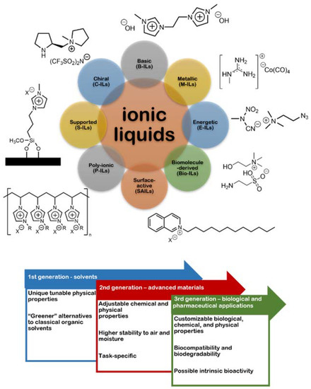ILs are salts formed by organic cations and organic or inorganic anions, which possess unique physical and chemical properties that differentiate them from the other (“conventional”) salts. The most emblematic feature of ILs is their very low melting points (usually, but not necessarily, below 100 °C), due to a lack of ion symmetry and to low charge density, which results in Coulombic interactions in the solid phase that are weaker than those in other salts [14]. Given the huge number of possible cation/anion combinations, reports to date cover an immense panoply of different ILs that can be classified in many different ways, depending on the classification criteria (Figure 9), as thoroughly reviewed elsewhere [123]. In general, three generations of ILs have been recognized, going from the earlier examples of ILs proposed as “greener” surrogates of classical organic solvents to the next generation of ILs whose chemical and physical properties were adjustable to their specific applications (task-specific ILs, or TSILs), and finally to ILs displaying low toxicity, biocompatibility, biodegradability and, in some cases, even bioactivity [120,121,123,124,125].