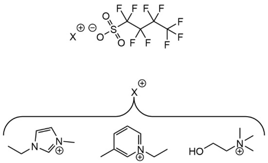 Perfluorobutanesulfonate-based ILs comprising the (from left to right) 1-methyl-3-ethylimidazolium, 1-methyl-3-ethylpyridinium, and cholinium cations, as reported by Vieira et al. [166]. Adapted with permission from ref. [166]. Copyright 2020 MDPI.