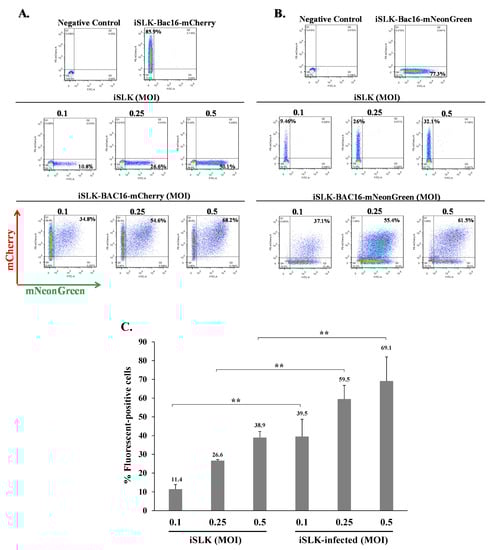 KSHV-infected iSLK cells can be superinfected and display enhanced expression of the fluorescent marker of the incoming virions. Naive iSLK cells and latently infected iSLK cells that carry (A) BAC16-mCherry or (B) BAC16-mNeonGreen were seeded in six-well plates (500,000 cells per well). The next day, the cells were infected with (A) BAC16-mNeonGreen or (B) BAC16-mCherry viruses at MOIs of 0.1, 0.25, and 0.5 using spinoculation. After 48 h, the cells were harvested, and the percentages of cells expressing mNeonGreen and mCherry were measured by FACS. (C) Percentage of cells expressing the fluorescent protein (mNeonGreen/mCherry) encoded by the incoming viral genome. iSLK—naive uninfected cells, iSLK-infected-latently iSLK-infected cells that were re-infected. Results show the average of three independent experiments. Statistical analysis was carried out using Tukey’s post hoc analysis test. ** p < 0.01. Naive uninfected iSLK cells were used as a negative control, while iSLK-BAC16-mCherry and iSLK-BAC16-mNeonGreen served as positive controls.