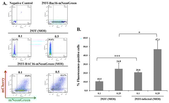 KSHV-infected HEK-293T cells can be superinfected and display enhanced expression of the fluorescent marker of the incoming virions. (A) Naive HEK-293T cells and latently infected HEK-293T cells that carry BAC16-mNeonGreen were seeded in six-well plates (500,000 cells per well). The next day, the cells were infected with BAC16-mCherry viruses at MOIs of 0.1 and 0.5 using spinoculation. After 48 h, the cells were harvested, and the percentages of cells expressing mNeonGreen and mCherry were measured by FACS. (B) Percentage of cells expressing the fluorescent protein (mNeonGreen/mCherry) encoded by the incoming viral genome. 293T—naive uninfected cells, 293T-infected-latently 293T-infected cells that were re-infected. Results shown are averages of three independent experiments. Statistical analysis was carried out using Tukey’s post hoc analysis test. *** p < 0.001, * p < 0.05. Naive uninfected HEK-293T cells were used as a negative control, while BAC16-mCherry and iSLK-BAC16-mNeonGreen-infected HEK-293T cells served as positive controls.