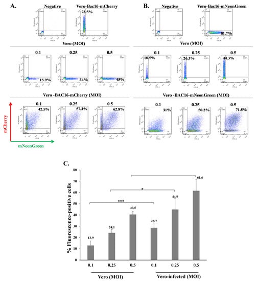 Superinfection was also evaluated in Vero cells which are incapable of interferon production, yet respond to externally added interferon [,]. Naive uninfected and latent BAC16-mCherry-infected Vero cells were infected with BAC16-mNeonGreen at an MOI of 0.1, 0.25, and 0.5, and the percentage of cells expressing mNeonGreen was examined 48 h later by FACS. As shown in Figure 4A, like iSLK and HEK-293T cells, the percentages of cells expressing the mNeonGreen were higher in Vero cells that were already latently infected with BAC16-mCherry as compared to naive initially uninfected cells. Similar results were obtained when BAC16-mNeonGreen-infected Vero cells were infected with BAC16-mCherry (Figure 4B), and the differences between naive and infected cells in the percentages of cells expressing the fluorescent marker from the incoming virus were significant (Figure 4C). These results indicate that Vero cells that carry latent KSHV infection are also susceptible to further KSHV infection and more efficiently express the fluorescent marker gene encoded in the genome of the incoming viruses, compared to naive cells undergoing primary infection with KSHV. This indicates that the potentially weakened interferon response in latently infected cells does not appear to be involved in the greater proportion of cells expressing the viral marker gene in latently infected cells that undergo subsequent infection with KSHV.