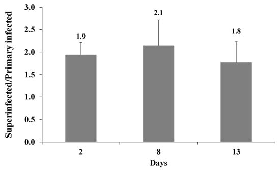 Finally, to verify that superinfection leads to the establishment of a latent infection, we examined the expression of the incoming virion fluorescent marker protein over time, while comparing cells that were superinfected relative to primary infected iSLK cells. As shown in Figure 6, the enhanced expression of the fluorescent marker gene of the incoming virions in superinfected cells as compared to primary infected cells, which was observed 48 h post infection, was maintained at longer time points of eight and 13 d post infection. No significant differences were found in the ratios of superinfected and primary infected fluorescent cells between the different time points after infection. These results suggest that cells that are latently infected with KSHV promote establishment and maintenance of latency of additional viral genomes following superinfection.