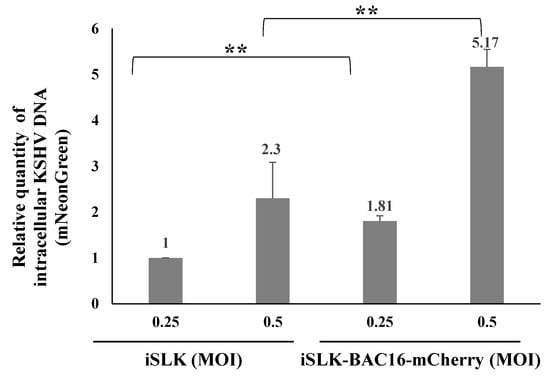 Superinfected cells contain higher levels of incoming viral DNA compared to primary infected cells. Uninfected and latently BAC16-mCherry-infected iSLK cells were infected with BAC16-mNeonGreen at MOI of 0.25 and 0.5 using the spinoculation method. High-molecular-weight DNA was extracted 48 h after infection, and the quantity of incoming viral DNA was measured using primers targeting the mNeonGreen fluorescent gene. The reactions were performed in triplicate, and the mean values obtained for the mNeonGreen fluorescent gene were normalized against the mean values obtained in the corresponding reactions of the ERV-3 cellular gene. DNA levels are shown relative to iSLK cells that were infected with BAC16-mNeonGreen virus at an MOI of 0.25, which was defined as 1 after normalization. Results obtained are from three independent experiments. Statistical analysis was performed using the ANOVA test and t-test. ** p < 0.01.