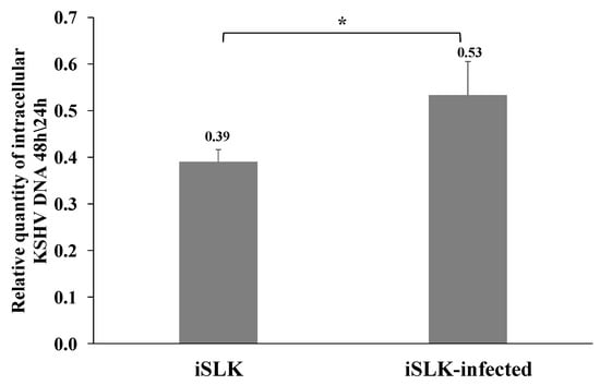 Relationship between the levels of incoming viral DNA in primary and superinfected cells 24 versus 48 h after infection. Uninfected and latently infected iSLK cells were infected with recombinant BAC16-mCherry or BAC16-mNeonGreen viruses at an MOI of 0.5 and processed as described in Figure 7 at 24 and 48 h post infection. Ratios of viral DNA levels obtained 48 and 24 h after infection are presented showing decreasing quantities of incoming viral DNA between 24 and 48 h post infection. Results obtained are from three independent experiments. Statistical analysis was performed using the Welch Two Sample t-test. * p < 0.05.