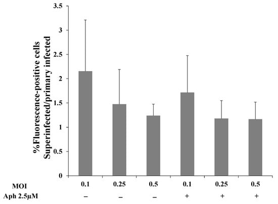 To examine whether greater replication of the incoming viral DNA or latency establishment prior to cell division account for the increased viral DNA in superinfected cells, we used aphidicolin, a potent and specific inhibitor of the B-family DNA polymerases. Aphidicolin inhibits DNA replication and cell division in eukaryotic cells and has also been reported to inhibit the DNA polymerase encoded by HSV-1 [,,]. First, we determined the working concentration of aphidicolin in iSLK cells and established that 2.5 µM aphidicolin leads to cell cycle arrest without triggering cell death. Subsequently, we performed FACS experiments to examine how aphidicolin affects primary infection and superinfection. Uninfected and latently BAC16-mCherry or BAC16-mNeonGreen-infected iSLK cells were treated with aphidicolin 1 h prior to infection, or left untreated, infected with BAC16-mNeonGreen or BAC16-mCherry at an MOI of 0.1, 0.25, or 0.5 and analyzed by FACS after 48 h. In line with the results shown in Figure 2, the ratio of the fractions of cells expressing the fluorescent marker gene of the incoming virions obtained for superinfected versus primary infected cells was greater than one at all three MOIs examined. Yet, the ratios obtained for cells treated with aphidicolin versus untreated cells were not significantly different (Figure 9). These results do not support the hypothesis that increased transient replication of the incoming viral DNA in the superinfected cells relative to the primary infected cells provides an advantage to the superinfected cells. Furthermore, aphidicolin treatment is accompanied by inhibition of cell division, and therefore the advantage of superinfected cells does not appear to be due to greater preservation of the incoming viral episomes in progeny cells.