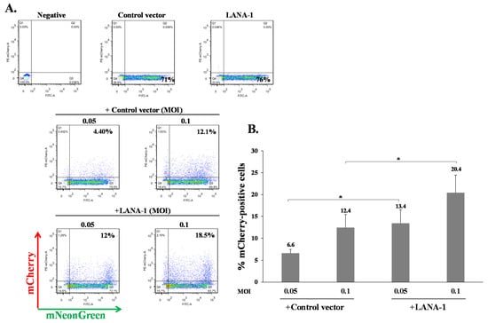 Role of LANA-1 in enhancing latency in HEK-293T. (A) HEK-293T cells were transfected with HA-tagged LANA-1 expression plasmid that also expressed ZsGreen fluorescent protein or with control plasmid. After 24 h, the cells were infected with BAC16-mCherry viruses at an MOI of 0.05 and 0.1 using spinoculation. Cells were harvested 48 h after infection, and the percentage of cells expressing mCherry in ZsGreen-positive cells was measured by FACS. The images represent one experiment out of three that demonstrated similar results. (B) Percentage of cells expressing mCherry following infection of cells transfected with LANA-1 expression vector or control vector; results shown are the average of three independent experiments. Statistical analysis was performed using the one-way ANOVA test and Tukey’s post hoc analysis tests. * p < 0.05.