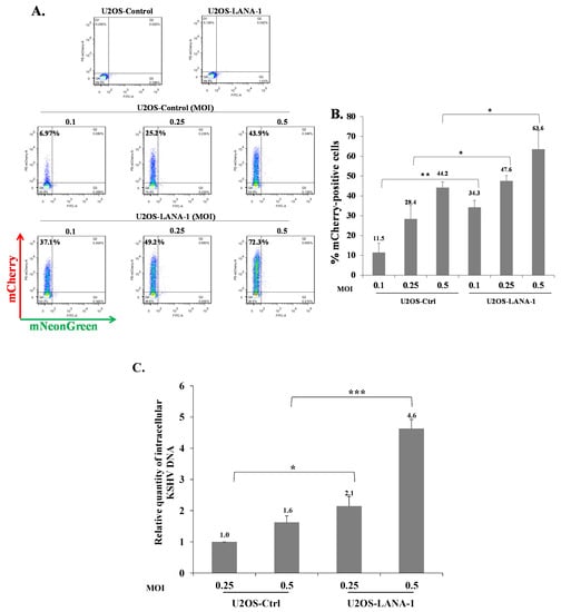 Our results indicate that KSHV-infected cells are permissive for secondary superinfection with KSHV, and that this infection results in establishment of greater latency relative to that of primary infection. This phenomenon was assumed to rely on ongoing expression of viral gene product/s that promote establishment of latency in superinfected cells. A limited number of viral gene products are expressed during latency to enable preservation and replication of the viral episomes in the infected cell nucleus, while inhibiting cell death and evading the immune response. Most of the genes expressed during latency are located in a genomic cluster known as the major latency locus, of which the latency-associated nuclear antigen 1 (LANA-1) is considered essential for the establishment and maintenance of latency in all cell types. Hence, we examined whether infection of cells that are already expressing LANA-1 results in enhanced establishment of latency. Accordingly, we transfected HEK-293T cells with an HA-tagged LANA-1 expression plasmid that also expresses ZsGreen fluorescent protein or with a control plasmid, and 24 h later, infected the cells with BAC16-mCherry viruses at an MOI of 0.05 or 0.1. mCherry expression was monitored 48 h post infection in cells expressing ZsGreen, which marked transfected cells. As shown in Figure 10A, the fraction of mCherry expressing cells in cells transfected with LANA-1 expression vector and expressing ZsGreen was higher compared to mCherry expressing cells that were transfected with the control vector. Three replicate experiments were performed, demonstrating a significantly increased mean percentage of cells expressing the marker fluorescent protein of the incoming viruses in infected cells that already expressed LANA-1 (Figure 10B). Similar results were obtained in U2OS cells that were engineered to express a doxycycline (Dox)-inducible LANA-1 protein []. U2OS containing LANA-1 expression cassette or control vector were treated with Dox for 24 h and then infected with BAC16-mCherry viruses at an MOI of 0.1, 0.25 and 0.5 in the presence of Dox. As shown in Figure 11A,B, cells expressing LANA-1 demonstrated higher percentages of mCherry-positive cells compared to the control cells, in which there was no LANA-1 expression. Moreover, we quantified the viral genomes in U2OS cells expressing LANA-1 compared to control cells, revealing significantly greater copy number of viral DNA in cells expressing LANA-1 compared to the control cells (Figure 11C). These results indicate that prior expression of LANA-1 in cells promotes the establishment of latent KSHV infection as evident by the relatively higher rates of fluorescent cells and greater quantities of viral DNA compared to cells that do not express this protein prior to or during infection.