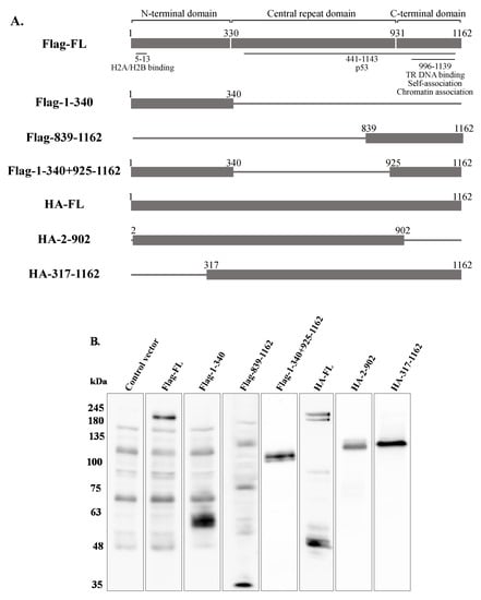 Full-length and fragments of LANA-1 containing N-terminal Flag tag were previously described [,]. Full-length and fragments of LANA-1 containing N-terminal HA were generated by PCR and cloned into NotI and NheI site within the DsRed expression plasmid, which also contains a ZsGreen fluorescent protein expression cassette. These plasmids were transfected into HEK-293T cells using the calcium-phosphate method.