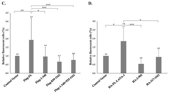 In order to map the domain/s of LANA-1 which are necessary for promoting the establishment of latent KSHV infection in superinfected cells, we used two sets of expression plasmids encoding various fragments of this protein. To this end, we used plasmids encoding the N-terminus (aa 1–340), the C-terminus (aa 839–1162), both N- and C-termini (aa 1–340, 839–1162), and full-length LANA-1 (aa 1–1162) that were N-terminally tagged with Flag, as well as HA-tagged expression plasmids encoding the central region of the protein, which includes multiple sequence repeats, fused to the amino terminal (aa 2–902) or to the carboxy terminal (aa 317–1162) of LANA-1, and full-length LANA-1 (Figure 12A). HEK-293T cells were transfected with the different expression plasmids, and after 24 h were infected with BAC16-mCherry viruses. WB analysis confirmed the expression of LANA-1 protein and its fragments (Figure 12B) The percentage of cells expressing the fluorescent mCherry protein was measured 48 h after infection, and was significantly higher in cells transfected with the plasmids encoding Flag (Figure 12C) or HA-tagged (Figure 12D) full-length LANA-1, compared to cells transfected with control plasmids. In contrast, all tested LANA-1 fragments failed to elicit an increased percentage of cells expressing the fluorescent protein. These results indicate that expression of full-length LANA-1 protein is required to promote the establishment of latent KSHV infection in cells.