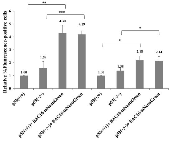 Previous studies showed that LANA-1 binds the p53 tumor suppressor protein and inhibits its activity while promoting cell cycle progression and induction of chromosomal instability and preserving cell survival [,,]. In addition, LANA-1 participates in the ubiquitylation of p53 []. To examine whether p53 takes part in the LANA-1-mediated pathway promoting the establishment of latent KSHV infection, we used HCT-116 cells expressing wild-type p53 protein (HCT-p53+/+) and an isogenic line lacking full-length p53 expression (HCT-p53−/−). These cells were previously shown to enable both latency establishment and productive lytic reactivation of KSHV []. Both cells were infected with BAC16-mNeonGreen, and cells containing the viral episome were selected for 14 days. Primary infection and superinfection at an MOI of 0.1 and 0.25 in both cell types were characterized, as described above. As shown in Figure 13, as in iSLK, HEK-293T and Vero cells, superinfected HCT-116 cells demonstrated higher percentages of fluorescent cells. Similar efficiency of latency establishment was observed in both cell types regardless of p53 expression. Thus, in contrast to LANA-1, p53 does not appear to be involved in the promotion of latency establishment of KSHV during superinfection.