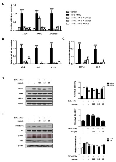 Effect of OA on chemokine and NF-κB and Akt activation in TNF-α/IFNγ-stimulated HaCaT cells (A–C) The mRNA level of cytokines and chemokines in HaCaT cells were determined by qRT-PCR. (D,E) Total proteins were prepared, and Western blot analysis was performed using specific antibodies. β-actin was used as internal control. Densitometric analysis was performed using Bio-Rad Quantity One® Software. The data shown represent mean ± S.D. of three independent experiments. ### p < 0.001 vs. the control group; * p < 0.05, ** p < 0.01, and *** p < 0.001 vs. TNF-α/IFN-γ-treated group.