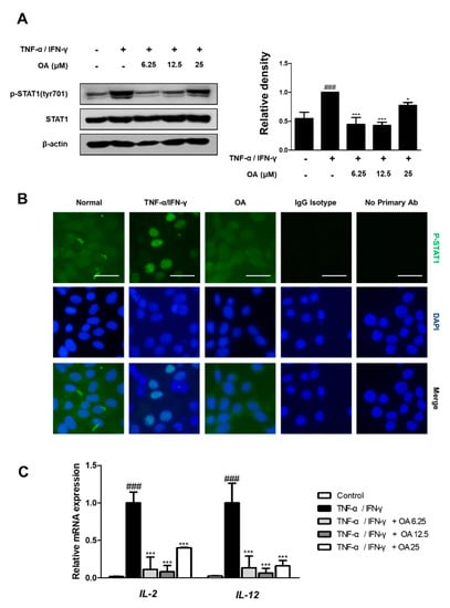 To investigate the mechanism responsible for the inhibitory effect of OA in parallel with the inhibition of NF-κB, we investigated its effect on TNF-α/IFN-γ-induced STAT1 activation. As shown in Figure 6A,B, treatment with TNF-α/IFN-γ resulted in the activation of STAT1 (p < 0.001). However, OA decreased the phosphorylation at Tyr701 with significance and alleviated the nuclear translocation of STAT1 in TNF-α/IFN-γ-stimulated HaCaT cells (Figure 6B). In addition, the expression of cytokines, such as IL-2 and IL-12, which are involved in the phosphorylation of STAT1, was downregulated by OA treatment compared to TNF-α/IFN-γ-treated HaCaT cells (p < 0.001) (Figure 6C). The results demonstrated that the anti-inflammatory effects of OA in HaCaT and DNCB-induced AD mice are associated with the STAT1 signaling pathway.