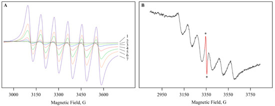 The EPR spectra in leaves with (A) and without (B) Mn sulfate in the nutrient medium. (A): (1)—0 mol/L, (2)—0.1 mol/L (control), (3)—0.2 mol/L, (4)—0.5 mol/L, (5)—1 mol/L, (6)—2 mol/L, (7)—10 mol/L. (B): the additional line is indicated by the asterisks.