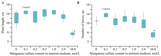 (A,B) The biometric parameters depending on Mn sulfate concentration in nutrient medium; * p ≤ 0.01 compared to the control according to the Mann–Whitney test.
