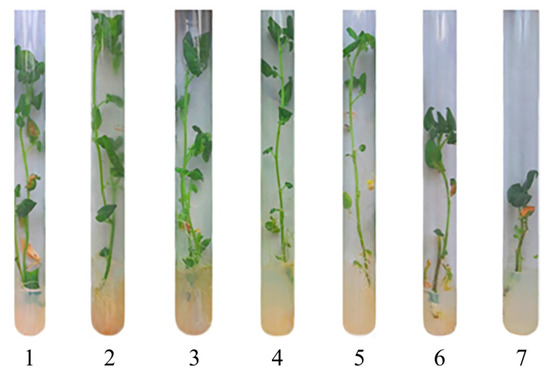 Photos of potatoes grown with different Mn sulfate content in the nutrient medium; (1)—0 mol/L, (2)—0.1 mol/L (control), (3)—0.2 mol/L, (4)—0.5 mol/L, (5)—1, (6)—2 mol/L, (7)—10 mol/L.