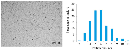Natural polysaccharides formed aggregately stable NCs (AG-Mn, AGS-Mn, and κ-CG-Mn), in which Mn-containing nanoparticles were stabilized by a biopolymer shell. According to TEM data, in the films of the obtained NCs in the matrix, electron-dense round nanoparticles with an average size of 3–6 nm were generated (Figure 4). Nanoparticles formed almost no cluster groups and were usually distant from each other in the bulk of the polymer.