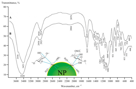 The nanoparticles were most likely formed as Mn(OH)2×nH2O and were stabilized in the matrix on oxygen atoms and hydroxyl groups [35,36] (Figure 5). Polysaccharides have a propensity to form corresponding coordination biopolymer complexes with some ions of mono and divalent metals, which can be located on the surface of metal-containing nanoparticles. According to data from the Fourier transform infrared (FTIR) spectroscopy, the formation of these NCs was not accompanied by structural changes in the polysaccharide (Figure 5). Comparative analysis of the FTIR spectra of the initial polymers and NCs revealed a broadening of the absorption bands in the high frequency region of the FTIR spectra of NCs at 3200–3600 cm−1, which is attributable to the stretching vibrations of the hydroxyl groups δ(OH), thus indicating complexation with Mn2+ and the presence of bound water in the compounds [37,38,39]. The broadening of OH stretching vibrations during complexation is associated with the participation of sugar OH groups in metal–ligand bonding. It should be noted that the main broadenings of OH stretching vibrations in the spectra of the NCs were due to the presence of a strong hydrogen network between the OH groups of the polysaccharide matrix and H2O molecules in the metal–polysaccharide crystal structures, which are responsible for the stabilization of solid structure and for retaining aggregated units. Such a system of hydrogen bonding was found in the crystal structure of Mn(D-gluconate)2×2H2O salt [40]. In addition, the maximum of the absorption band from δ(OH) vibrations (at 1430 cm−1), characteristic of one of the possible positions of the CH2OH group, shifted towards lower frequencies, which also evidences ionization due to complexation [39].