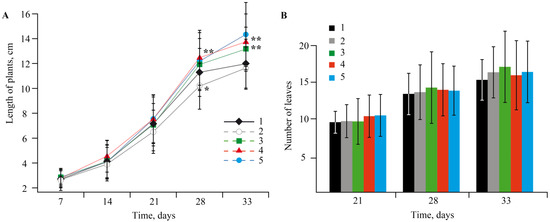 Dynamics of the biometric parameters of length of plants (A) and number of leaves (B) in the control medium and in plants grown in a nutrient medium with NCs; (1)—control, (2)—without Mn sulfate in medium, (3)—AG-Mn, (4)—AGS-Mn, (5)—κ-CG-Mn; * p ≤ 0.05 and ** p ≤ 0.01 compared to the control according to the Mann–Whitney test.