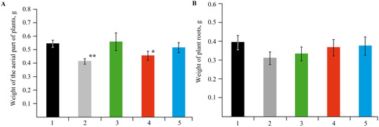 Mass of the vegetation of plants (A) and the biomass of roots (B) in the control medium and in plants grown in a nutrient medium with NCs; (1)—control, (2)—without Mn sulfate in medium, (3)—AG-Mn, (4)—AGS-Mn, (5)—κ-CG-Mn; * p ≤ 0.05 and ** p ≤ 0.01 compared to the control according to the Mann–Whitney test.