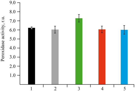 Peroxidase is a very sensitive enzyme to various stress factors. Therefore, changes in the activity of this enzyme can often be used to assess the body’s resistance to stress [45,46]. The activity of guaiacol-dependent peroxidase was determined by the Boyarkin method at the end of the plants’ co-incubation with NCs [47] (Figure 9).