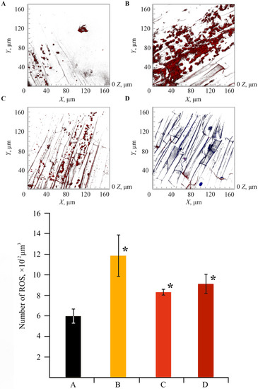 Confocal laser scanning microscopy (CLSM) images of the effect of NCs on ROS production and respective data on the number of ROS in plant tissues in the control (A), infected by Cms (B), treated with NCs (C), treated with NCs and infected by Cms (D); * p ≤ 0.01 compared to the control according to the Mann–Whitney test.
