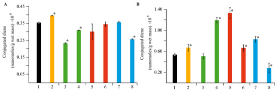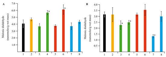 Effect of NC treatments on the content of malonic dialdehyde (MDA) in potato leaves (A) and roots (B), in comparison with the control group in vitro, as well as in plants infected by Cms pathogen; (1)—control without NCs and Cms, (2)—plants infected by Cms without NCs, (3)—AG-Mn without Cms, (4)—infected plants in the presence of AG-Mn, (5)—AGS-Mn without Cms, (6)—infected plants in the presence of AGS-Mn, (7)—κ-CG-Mn without Cms, (8)—infected plants in the presence of κ-CG-Mn; * p ≤ 0.01 compared to the control according to the Mann–Whitney test.