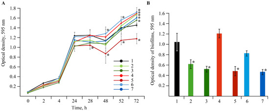 Effect of NC treatments with concentrations of Mn 0.000625% and 0.00625%† in volume on growth (A) and biofilm formation (B) of Cms pathogen; (1)—control, (2)—AG-Mn, (3)—AG-Mn†, (4)—AGS-Mn, (5)—AGS-Mn†, (6)—κ-CG-Mn, (7)—κ-CG-Mn†; * p ≤ 0.01 compared to the control according to the Mann–Whitney test.