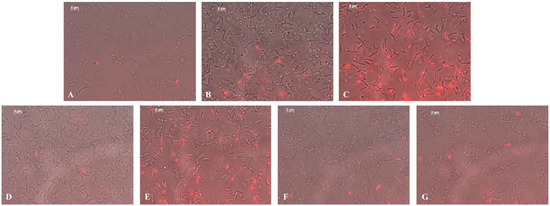 The high survival rate of bacteria is mainly ensured by their ability to form biofilm [56]. Bacteria release special substances in which their cells are immersed that make them more resistant to any external actions [57]. Biofilm formation is also observed for ring rot. These bacteria are able to accumulate in the conductive channels of the plant causing their blockage and, hence, the wilting of the stem [58]. Therefore, we next studied the effect of NCs on biofilm formation of the potato ring rot pathogen. It was found that AG-Mn and AGS-Mn with a concentration of Mn 0.00625% in volume inhibited bacterial biofilm formation, with the percentage of dead cells reaching up to almost 25% (Table 3). In the control sample, the number of dead cells was very low (Figure 14A; Table 3). Treatment of the bacteria with NCs at a concentration of 0.000625% led to the appearance of dead cells (Figure 14B,D,F; Table 3). At a 10-fold higher concentration of the composites, the number of dead bacterial cells greatly increased (Figure 14C,E,G; Table 3). The maximum percentage of dead cells was detected in the case of AGS-Mn (~25%) and κ-CG-Mn (~14%) at concentrations of 0.00625% (Table 3). After incubation, the cells also thickened and shortened compared to the control (Table 3).