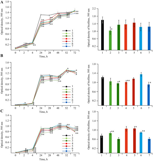 Effect of NC treatments with concentrations of Mn 0.000625% and 0.00625%† in volume on growth (left graph) and biofilm formation (right graph) of A. guillouiae (A), R. erythropolis (B) and P. oryzihabitans (C); (1)—control, (2)—AG-Mn, (3)—AG-Mn†, (4)—AGS-Mn, (5)—AGS-Mn†, (6)—κ-CG-Mn, (7)—κ-CG-Mn†; * p ≤ 0.05 and ** p ≤ 0.01 compared to the control according to the Mann–Whitney test.