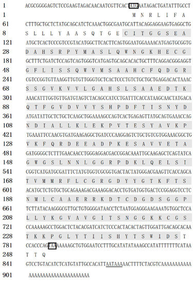 An assembled unigene (Unigene5167) of 657 bp annotated as Df from our previous transcriptome data [45] was selected for further cloning of the full-length cDNA of CiDf. Two specific primers, Df 5′ and Df 3′ (Table 1), were designed to amplify the full-length cDNA of CiDf by RACE technology. The total volume of the PCR was 50 µL, including 1 µL of cDNA, 25 µL of 2× EasyTaq PCR SuperMix (Vazyme, Nanjing, China), 1 µL of each gene-specific primer Df 5′ (Df 3′), 1 µL of Universal Primer A Mix, and 22 µL of H2O. The PCR programs were run as follows: 5 cycles at 94 °C for 30 s, 72 °C for 3 min; 5 cycles at 94 °C for 30 s, 70 °C for 30 s, and 72 °C for 3 min; 25 cycles at 94 °C for 30 s, 68 °C for 30 s, and 72 °C for 3 min. The PCR products were gel-purified using the MiniBest Agrose Gel DNA Extraction Kit Ver. 4.0 (Takara, Kyoto, Japan), cloned into the pUCm-T vector (Kanglang, Shanghai, China), and then sequenced by M13F(-47) and RV-M primers (Table 1).