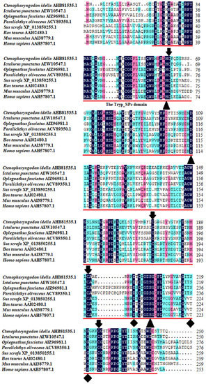 Multiple sequence alignments of CiDf with other vertebrates. The amino acid residues shaded in dark are conserved sites, and the functional domain is underlined in red. The critical residues of catalytic sites (serine protease active sites), the substrate-binding sites, and residues probably involved in disulfide pairing are indicated as solid triangles, solid diamonds, and solid arrows, respectively.