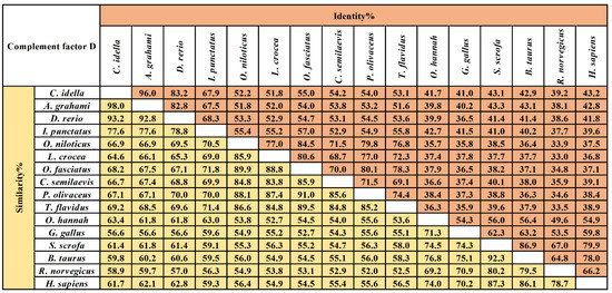 The amino acid sequence identity and similarity of Dfs among different vertebrates. The selected Dfs were from vertebrates including Ctenopharyngodon idella (AHB81535.1), Anabarilius grahami (ROK15838.1), Danio rerio (NP001018368.1), Ictalurus punctatus (AEW10547.1), Oreochromis niloticus (XP003447819.1), Larimichthys crocea (KKF28223.1), Oplegnathus fasciatus (AIZ96981.1), Cynoglossus semilaevis (XP008314450.1), Paralichthys olivaceus (ACV89350.1), Takifugu flavidus (TWW72489.1), Channa striata (SSC14279.1), Gallus gallus (XP_040548688.1), Sus scrofa (XP_013850255.1), Bos taurus (NP001029427.1), Rattus norvegicus (NP001071110.1), and Homo sapiens (NP001919.2). The values of similarity and identity are backgrounded in yellow and orange respectively.