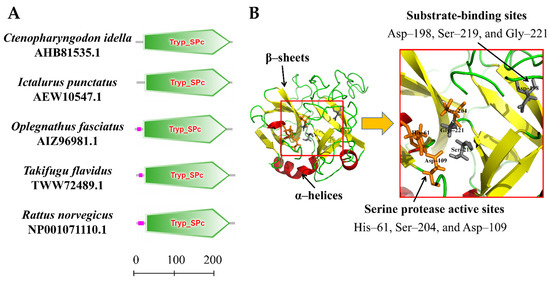Protein domains and three-dimensional structure of CiDf. (A) Protein domains of Dfs from Ctenopharyngodon idella, Ictalurus punctatus, Oplegnathus fasciatus, Takifugu flavidus, and Rattus norvegicus were compared. Tryp_SPc represents the trypsin-like serine protease. The scale on the bottom margin indicates amino acid number. (B) In the three-dimensional structure of CiDf, the catalytic sites are colored in orange, and the substrate-binding sites in gray.