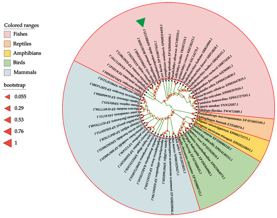 To determine the evolutionary feature of the CiDf protein, a phylogenetic tree was constructed based on full-length Df amino acid sequences from various vertebrates. The results showed that Dfs from mammalians, birds, reptiles, amphibians, and fishes were obviously separated into five branches in the phylogenetic tree. The CiDf was firstly clustered with that of A. grahami (ROK15838.1) and then clustered with Cyprinidae Dfs of Danio rerio (NP001018368.1), C. carpio (AYD42292.1), and C. auratus (XP_026079875.1). Finally, these five Dfs together with 21 other Dfs, mainly from Sciaenidae, Cichlidae, and Clupeidae species, formed a distinct fish branch (Figure 5).