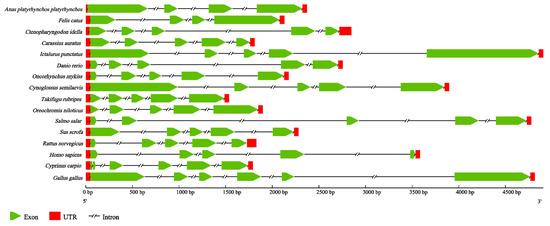 Genomic structure arrangements of Dfs from grass carp and other vertebrates. The red boxes, green wedges, and broken lines represent UTRs, exons, and introns of Dfs, respectively. All of the genomic sequences, including Dfs from Anas platyrhynchos platyrhynchos (ENSAPLG00000023562), Felis catus (ENSFCAG00000007308), Carassius auratus (ENSCARG00000016075), Ictalurus punctatus (ENSIPUG00000006895), Danio rerio (ENSDARG00000039579), Oncorhynchus mykiss (ENSOMYG00000016711), Cynoglossus semilaevis (ENSCSEG00000015236), Takifugu rubripes (ENSTRUG00000028684), Oreochromis niloticus (ENSONIG00000029006), Salmo salar (ENSSSAG00000064487), Sus scrofa (ENSSSCG00060010731), Rattus norvegicus (ENSRNOG00000033564), Homo sapiens (ENSG00000197766), Cyprinus carpio (ENSCCRG00000029196), and Gallus gallus (ENSGALG00000040832), were obtained from the ensemble database.