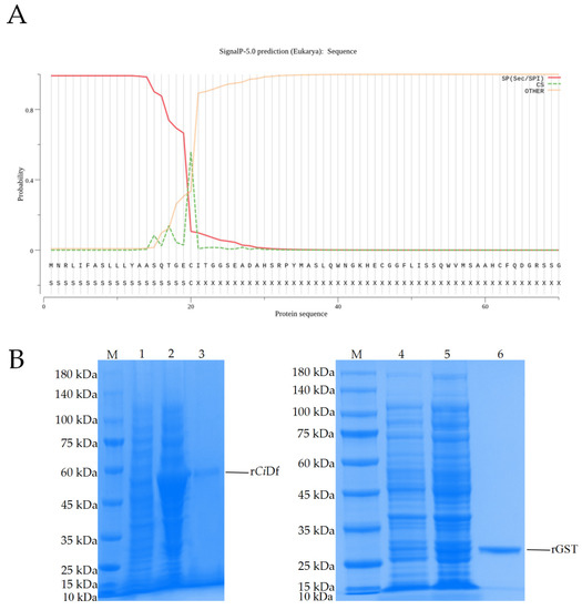 Signal peptide prediction for the CiDf protein and SDS-PAGE analysis of the recombinant CiDf protein. (A) The first 20 amino acid residues were predicted to form a signal peptide in the CiDf protein using the SignalP-5.0 tool. (B) SDS-PAGE analysis of recombinant CiDf protein. M: marker; Lane 1: lysates of pGEX-4T-1-CiDf plasmid transformed bacteria before induction; Lane 2: lysates of pGEX-4T-1-CiDf plasmid transformed bacteria after induction with 1 mM IPTG; Lane 3: purified rCiDf protein; Lane 4: lysates of pGEX-4T-1 plasmid transformed bacteria before induction; Lane 5: lysates of pGEX-4T-1 plasmid transformed bacteria after induction with 1 mM IPTG; Lane 6: purified rGST protein.
