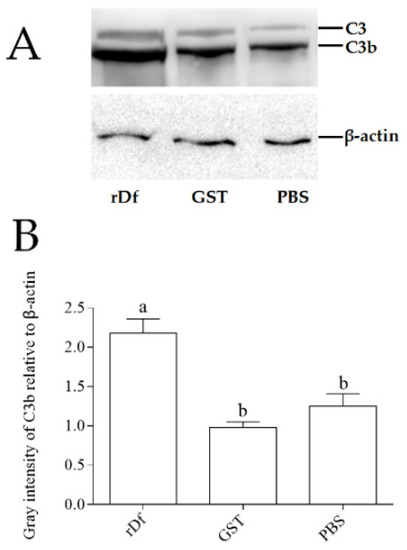 It has been demonstrated that Df can promote the cleavage of C3 into C3a and C3b. In order to verify whether the function of the CiDf protein was conserved, the purified rCiDf protein was incubated with grass carp serum overnight, and western blot analysis was conducted using the rabbit-anti-grass-carp C3 polyclonal antibody for the detection of C3 cleavage in grass carp serum. rGST proteins and PBS incubated with grass carp serum were set as the negative and blank control group, respectively. The results of the rCiDf group (rDf), the blank control group (PBS), and the negative control group (GST) all revealed two distinct bands of C3 and C3b in grass carp serum (Figure 8A). In addition, gray intensity analysis with β-actin as an internal reference protein showed that the relative content of the C3b protein in grass carp serum incubated with rCiDf was significantly higher than those in the negative control group (2.22-fold, p < 0.05) and the blank control group (1.74-fold, p < 0.05) (Figure 8B).