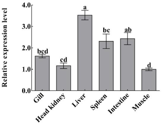 For the analysis of gene expression patterns in different tissues, the gill, head kidney, liver, spleen, intestine, and muscle were collected from five uninfected individuals. Total RNA was extracted from these tissues using Total RNA Kit II (Omega, Norcross, GA, USA) following the manufacturer’s instructions. The concentration of RNA was measured with a spectrophotometer (Eppendorf BioSpectrometer basic, Hamburg, Germany), and RNA integrity was evaluated using 1.0% agarose gel electrophoresis. Total RNAs with an OD260/280 value ranging from 1.8 to 2.0 were used for cDNA synthesis. The total RNA samples from various tissues were treated with DNase I and reverse-transcribed into cDNA using a Revert Aid First Strand cDNA Synthesis kit (Thermo Fisher Scientific, Waltham, MA, USA).