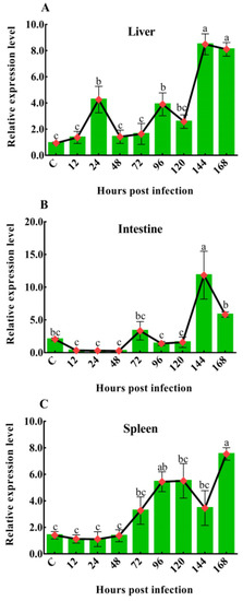 The mRNA expression patterns of CiDf in the liver (A), intestine (B), and spleen (C) during GCRV infection. Vertical bars represent the mean ± SD. The letters a–c represent significant differences among the expressions in the liver, spleen, and intestine at various time points post-GCRV challenge (p < 0.05).