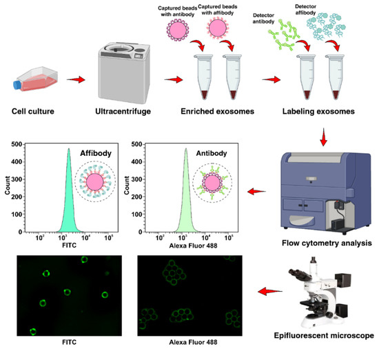 The workflow of detecting pre-enriched EGFR-positive exosomes from A549 cell line with novel Affibody probe using flow cytometry and fluorescent microscopy. The 10 µm carboxylate polystyrene microbeads functionalized with EDC were incubated with 1.5 µg of capture anti-EGFR Affibody and anti-EGFR antibody separately. Following the addition of pre-enriched exosomes and incubation for 18 h at 4 °C, the detector anti-EGFR-FITC Affibody and anti-EGFR-Alexa Fluor 488 antibody was added to the AffiBeads/antibody-coated beads and exosome mixture. Afterward, they were subjected to conventional flow cytometry and fluorescence microscopy.
