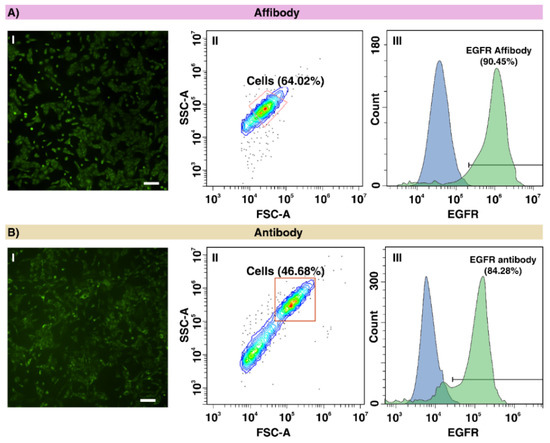 (A) Fluorescence microscopy images of A549 cells stained with I anti-EGFR-FITC Affibody using a FITC filter, II the flow cytometry dot-plot scatter and III the flow cytometry histogram overlay of the A549 cells stained with anti-EGFR-FITC Affibody. (B) Fluorescence microscopy images of A549 cells stained with I anti-EGFR-Alexa Fluor 488 antibody using a FITC filter, II the dot-plot scatter and III the flow cytometry histogram overlay of the A549 cells stained with anti-EGFR-Alexa Fluor 488 antibody (scale bar: 200 µm).